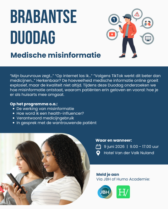 De hoeveelheid medische informatie online groeit explosief, maar de kwaliteit niet altijd. Tijdens deze Duodag onderzoeken we hoe misinformatie ontstaat, waarom patiënten erin geloven en vooral: hoe je er als huisarts mee omgaat. Op het programma o.a.: De werking van misinformatie Hoe word ik een health-influencer? Verantwoord medicijngebruik. In gesprek met de wantrouwende patiënt.